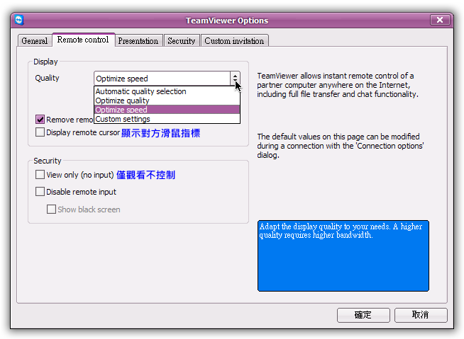 連線設定 (可以設定畫面速度與品質)。